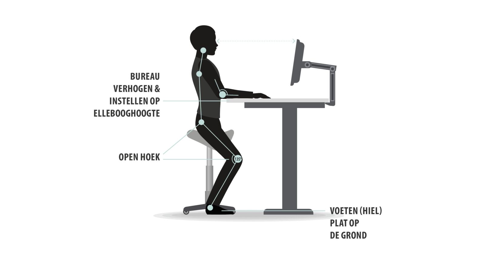 Afwisselen tussen zitten en staan tijdens het bureauwerk is gezond en essentieel voor het vermijden van kwalen. Daartussen zit nog een derde optie om even te breken met de passieve zithouding: de zit-sta positie. Zoals de naam het zegt, ga je hierbij een positie aannemen tussen zitten en staan die niet alleen de bloedsomloop bervordert, maar bovendien ook aanzet tot bewegen.