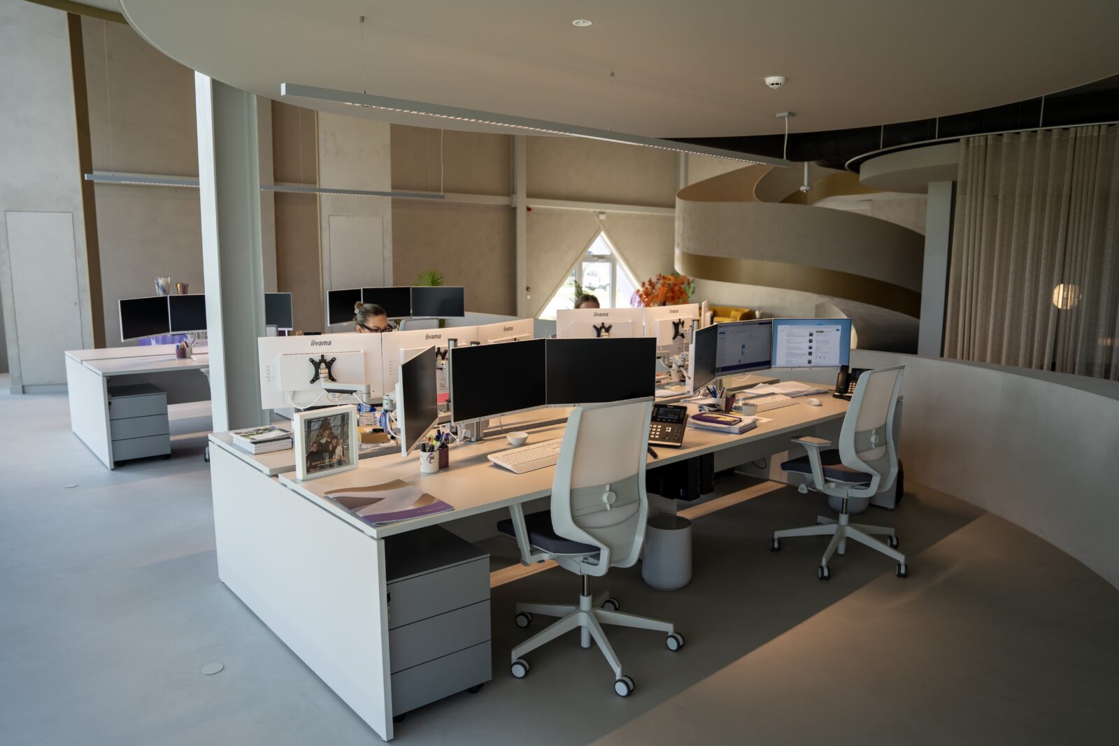 Elke werkplek is voorzien van een bijpassend mobiel ladenblok én monitorarmen met maar liefst drie schermen. Zo creëer je niet alleen extra ruimte, maar bevorder je ook een betere houding én een strakke, georganiseerde uitstraling.